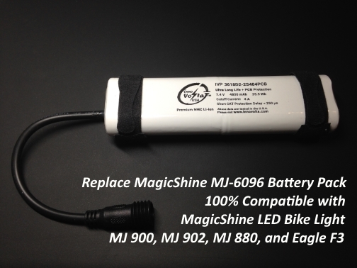 The innoVolta IVP3618D2-2S484PCB battery pack is mindfully designed for upgrading the MagicShine MJ-6096 battery pack. It is 100% compatible with the MagicShine bike LED light models: MJ 900, MJ 902, MJ 880, and Eagle M2.